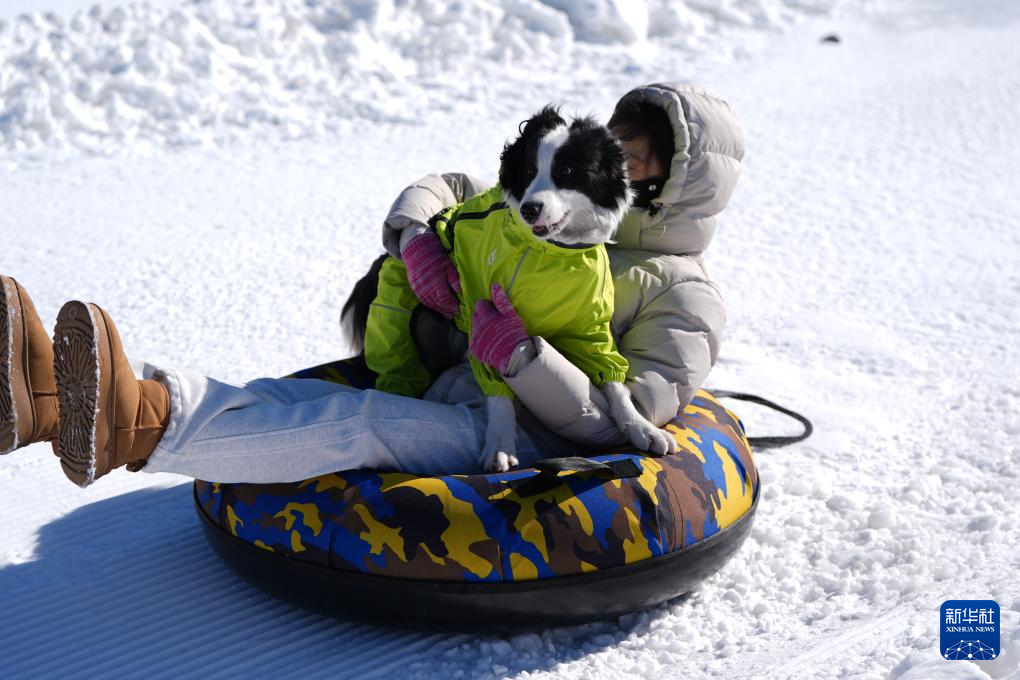2月7日,在北京漁陽·寵趣里寵物滑雪主題樂園,一名游客帶著寵物狗一起坐雪圈參加雪地保齡球趣味游戲。據“寵趣里”樂園負責人介紹,樂園自2025年12月22日開放以來,已累計接待近千只寵物狗。新華社記者 鞠煥宗 攝