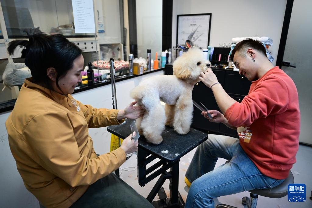 2月6日,在安徽省合肥市一家名叫“極愛寵物”的店內,工作人員給小狗做美容。新華社記者 周牧 攝