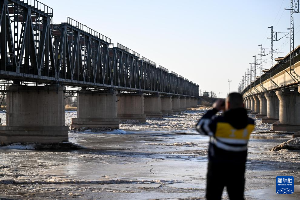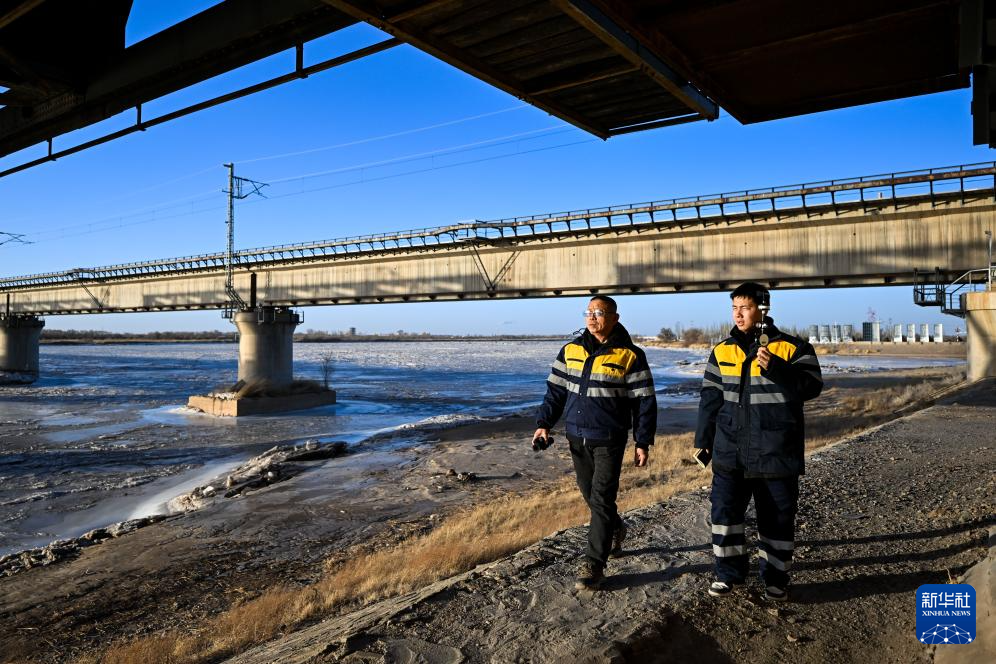 2月10日,馬瑞祥(左)與工友在包蘭鐵路三盛公黃河鐵路特大橋下進行巡檢作業。新華社記者 李志鵬 攝