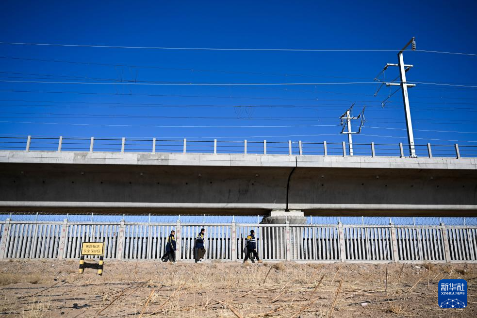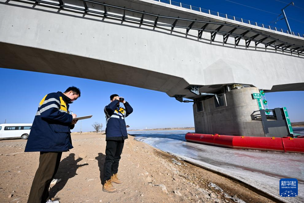 2月10日,白宇泰(右一)與工友在包銀高鐵磴口黃河特大橋下進行巡檢作業。新華社記者 李志鵬 攝
