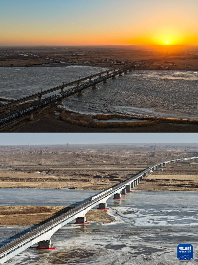 這是一張拼版照片:上圖為2月11日拍攝的包蘭鐵路三盛公黃河鐵路特大橋(無人機照片);下圖為2月10日拍攝的包銀高鐵磴口黃河特大橋(無人機照片)。新華社記者 李志鵬 攝
