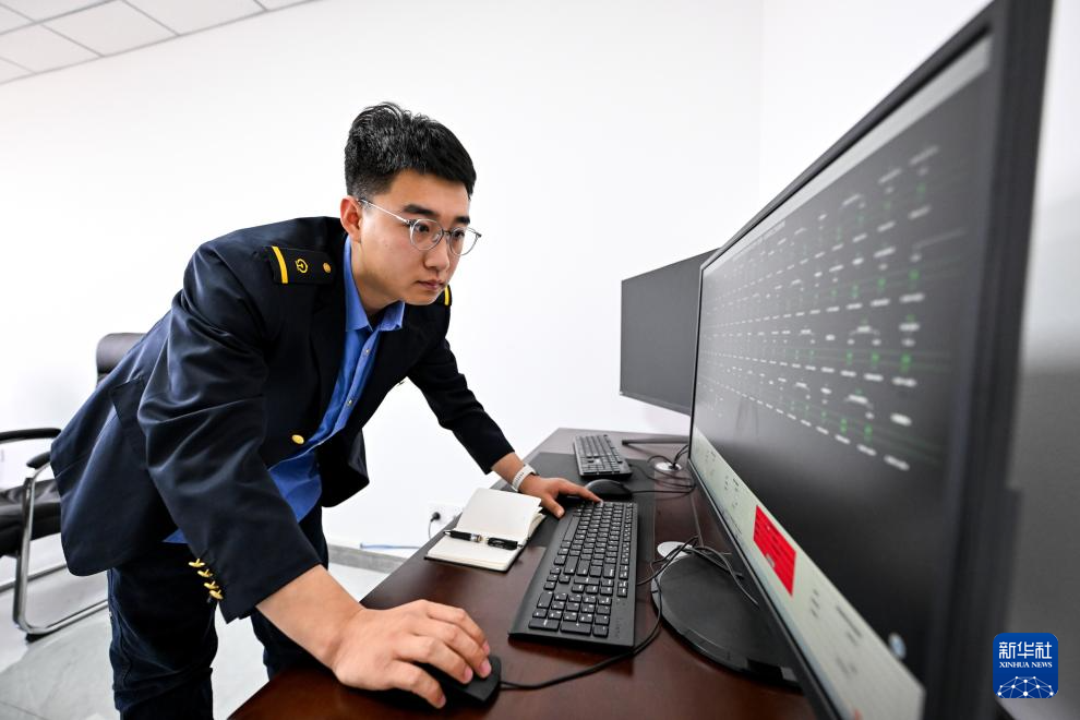2月9日,在烏海工務段臨河高鐵綜合維修基地,白宇泰通過監測系統查看包銀高鐵磴口黃河特大橋情況。新華社記者 李志鵬 攝