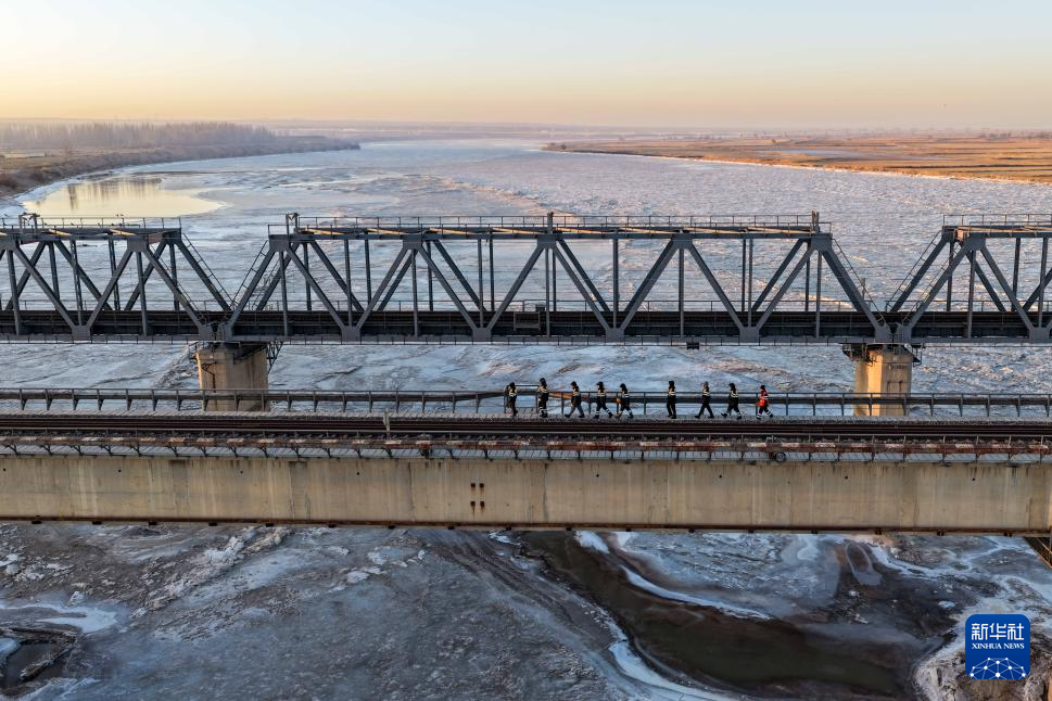 2月11日,橋隧工人作業結束后走在包蘭鐵路三盛公黃河鐵路特大橋二號橋上(無人機照片)。新華社記者 李志鵬 攝