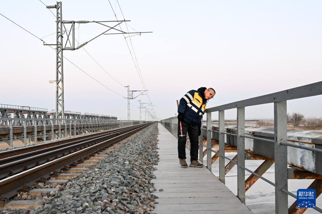2月11日,馬瑞祥在包蘭鐵路三盛公黃河鐵路特大橋二號橋上進行巡檢作業。新華社記者 李志鵬 攝