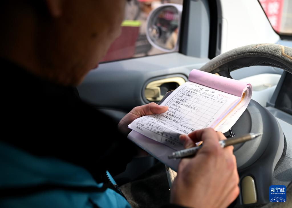 2月10日,在河南省周口市鹿邑縣玄武鎮,馬高杰查看送貨清單。新華社記者 郝源 攝
