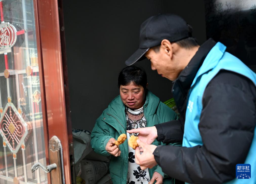 2月9日,在河南省周口市鹿邑縣邱集鄉,馬高杰(左)把年貨拿給村民。新華社記者 郝源 攝
