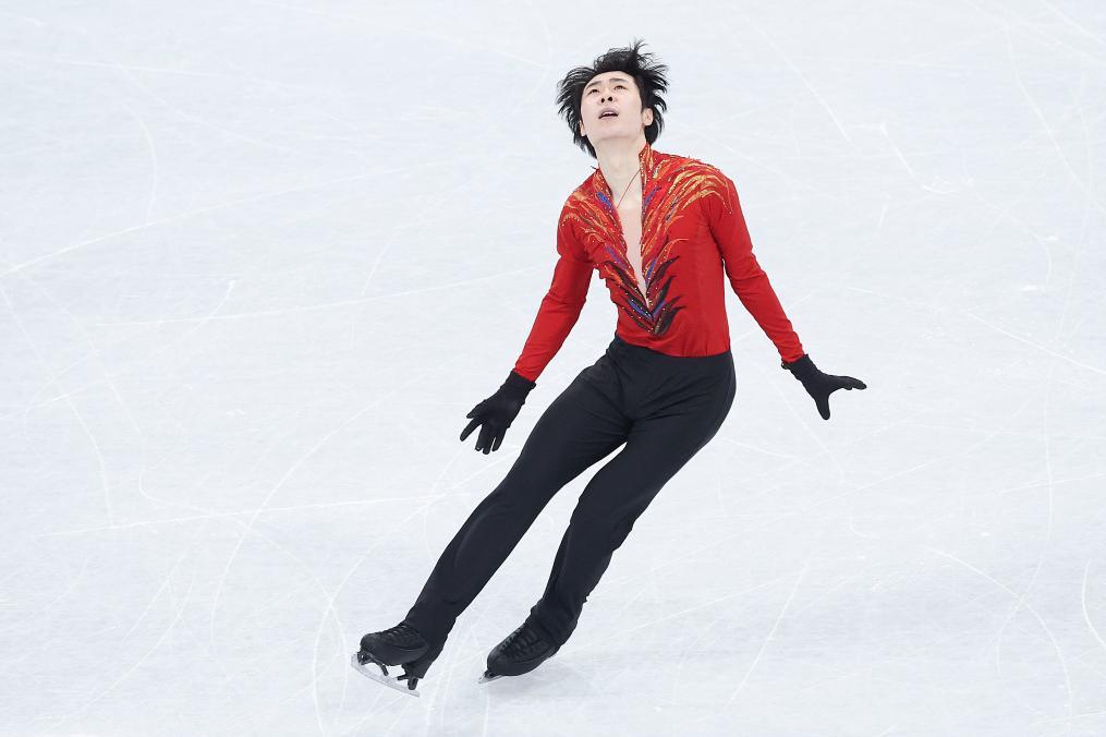 2022年2月10日,中國選手金博洋在比賽中。當日,北京2022年冬奧會花樣滑冰男單自由滑比賽在首都體育館舉行。新華社記者 張玉薇 攝