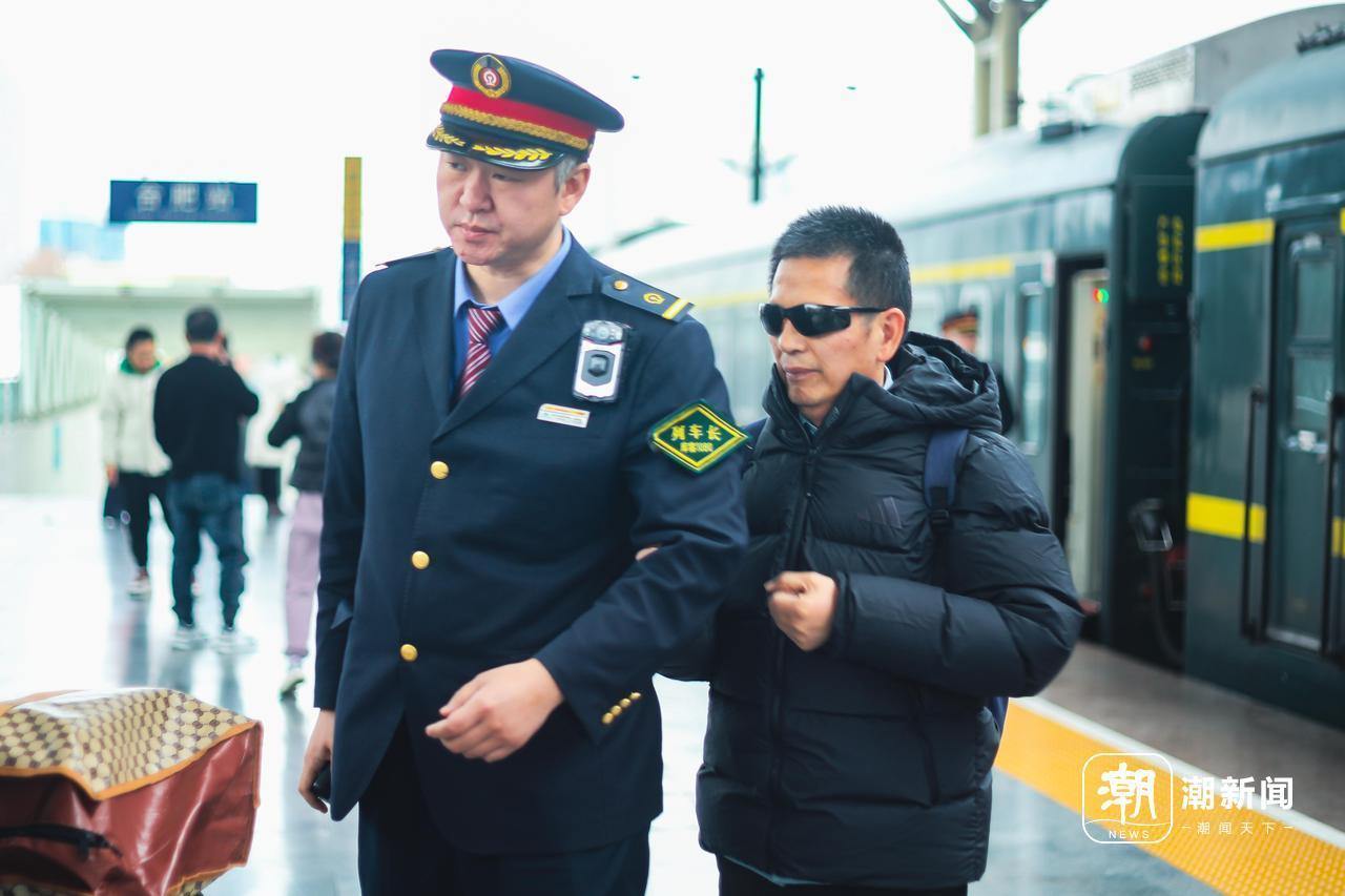 列車長(zhǎng)李銘扶著盲人下車。謝春暉/攝