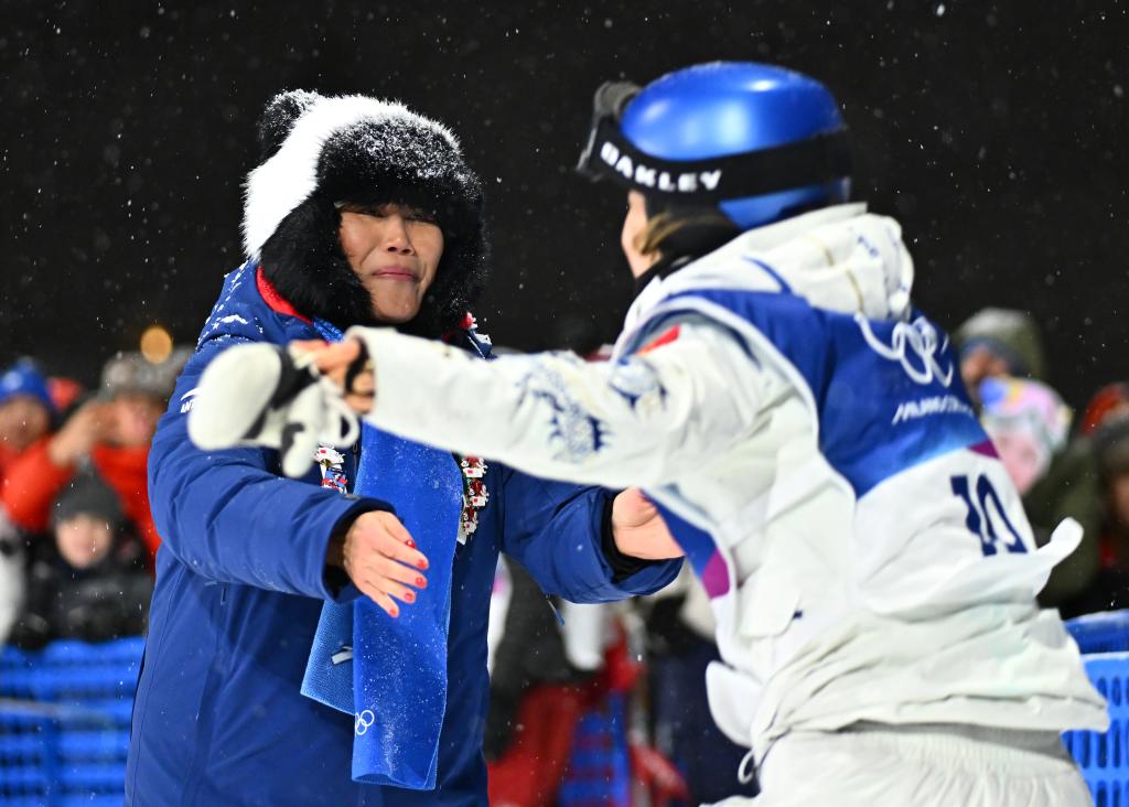 2月16日,中國選手谷愛凌(右)與在場邊的母親擁抱。新華社記者 張宏祥 攝