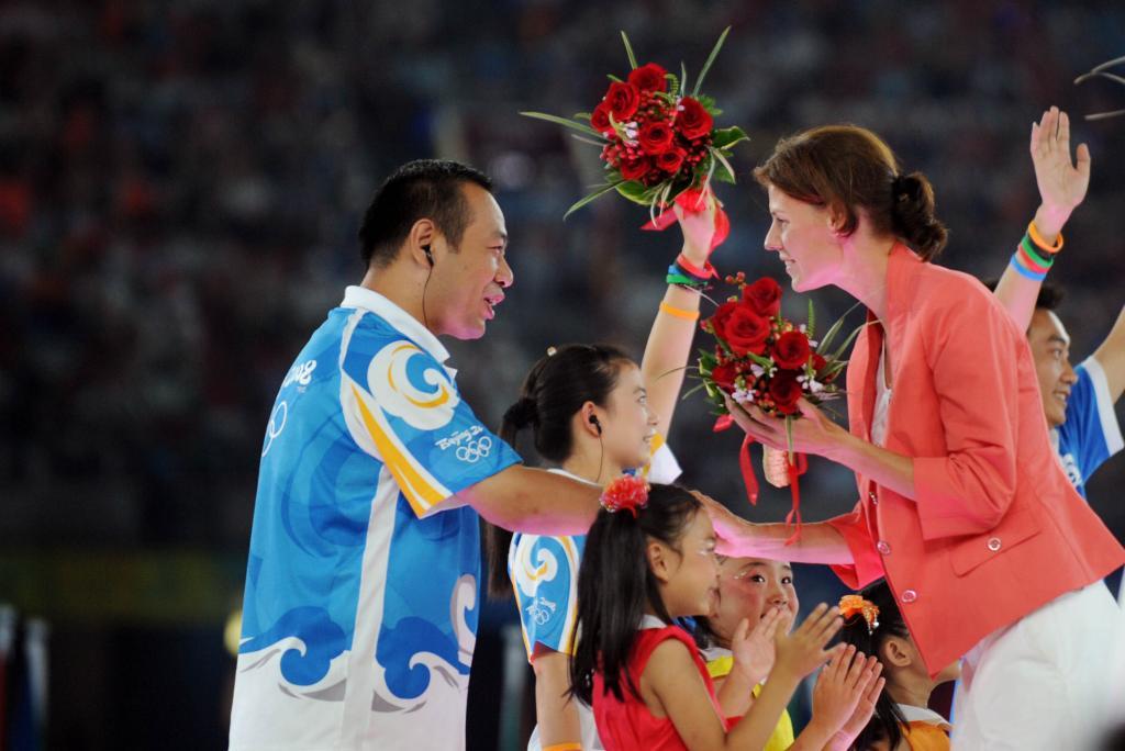 這是志愿者代表(左)在2008年北京奧運會閉幕式上接受國際奧委會運動員委員會新委員的獻花(2008年8月24日攝)。 新華社記者李尕攝