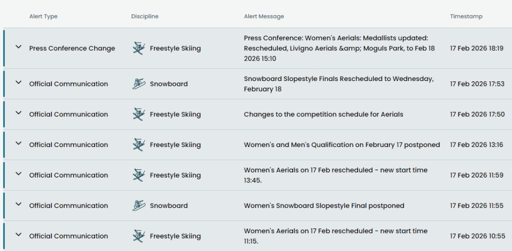 圖為米蘭冬奧組委17日發布的多條賽事改期通知