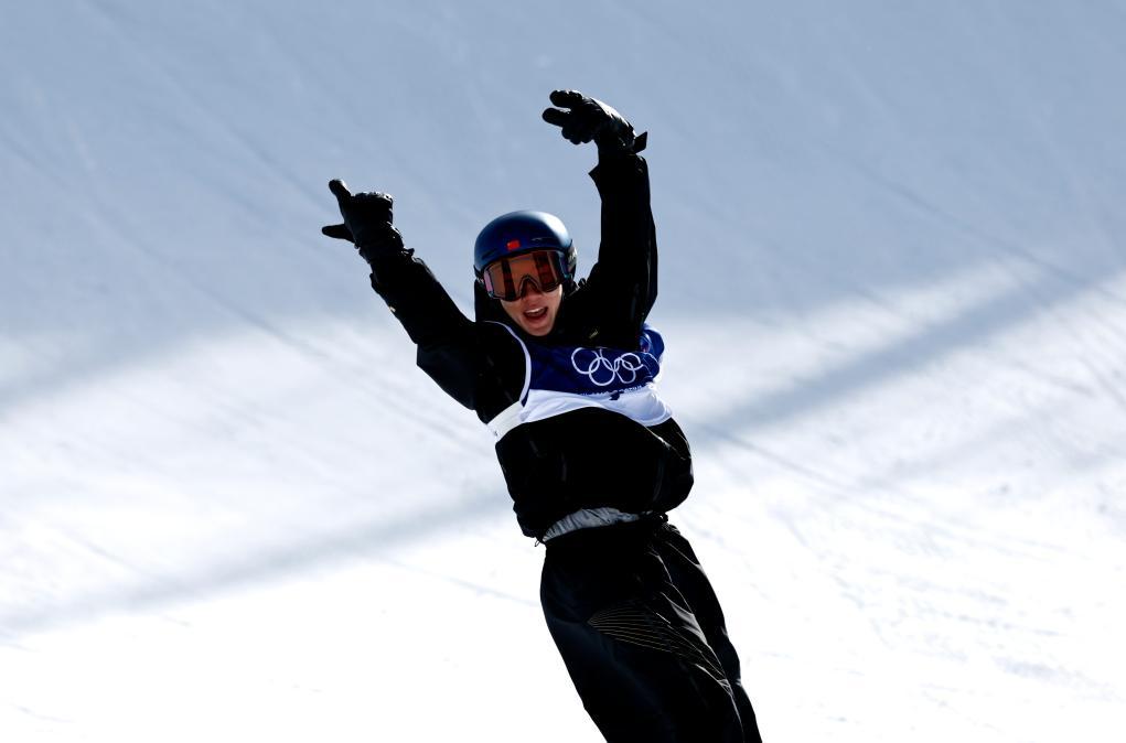 徐夢桃在張家口云頂滑雪公園舉行的北京2022年冬奧會自由式滑雪女子空中技巧決賽奪冠后慶祝(2022年2月14日攝)。新華社記者 吳壯 攝