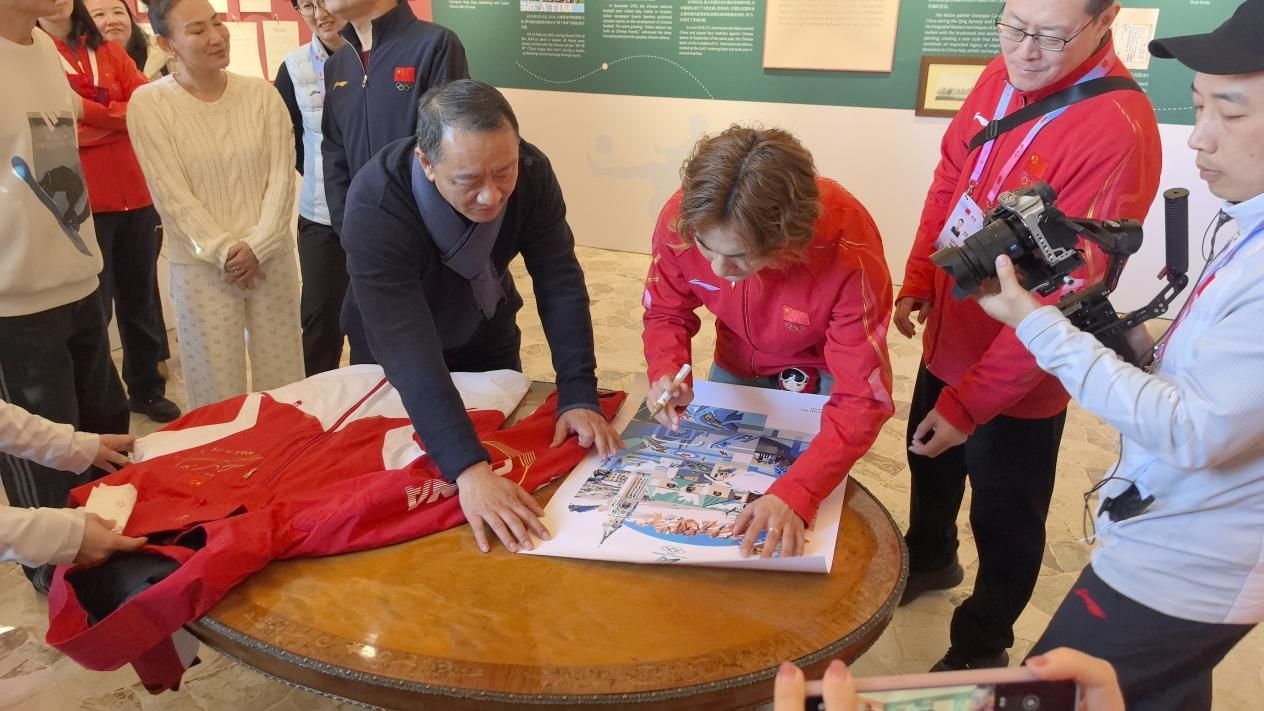 2月20日,2026年米蘭—科爾蒂納冬奧會單板滑雪男子坡面障礙技巧冠軍蘇翊鳴來到“中國之家”,將親筆簽名的滑雪板捐贈給中國體育博物館,并在中國體育代表團領獎服、1956-2026冬奧會紀念海報上簽名。