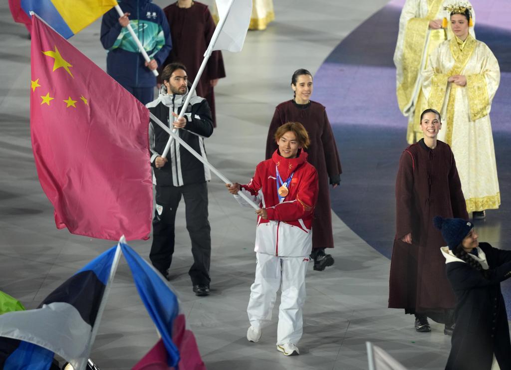 2月22日,中國體育代表團旗手蘇翊鳴在2026年米蘭-科爾蒂納冬奧會閉幕式上入場。新華社記者 薛宇舸 攝
