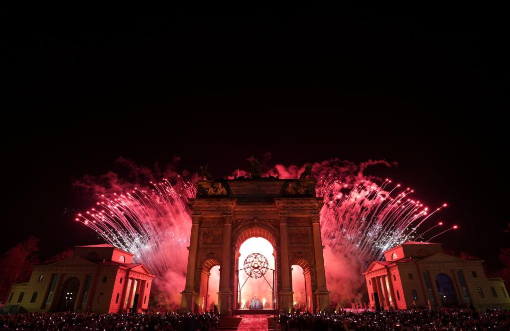 2月6日,在米蘭和平拱門,主火炬被點(diǎn)燃。新華社記者 孫非 攝