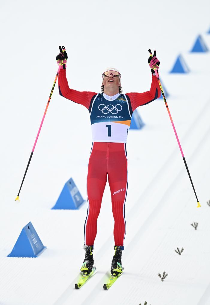 2月21日,挪威選手克萊博慶祝奪冠。新華社記者 賀燦鈴 攝