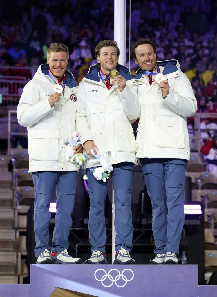 2月22日,越野滑雪男子50公里集體出發(fā)(傳統(tǒng)技術(shù))冠軍挪威選手克萊博(中)、亞軍挪威選手尼格特(左)和季軍挪威選手伊韋爾森在閉幕式現(xiàn)場(chǎng)舉行的頒獎(jiǎng)儀式上。新華社記者 李明 攝