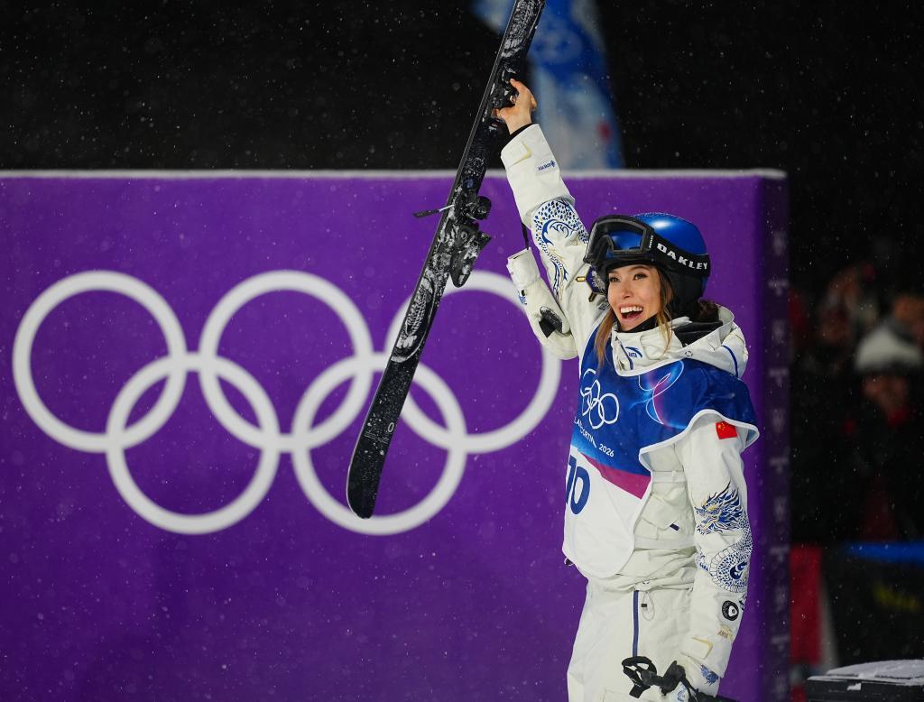 2月16日,中國選手谷愛凌在比賽后慶祝。新華社記者 胡超 攝