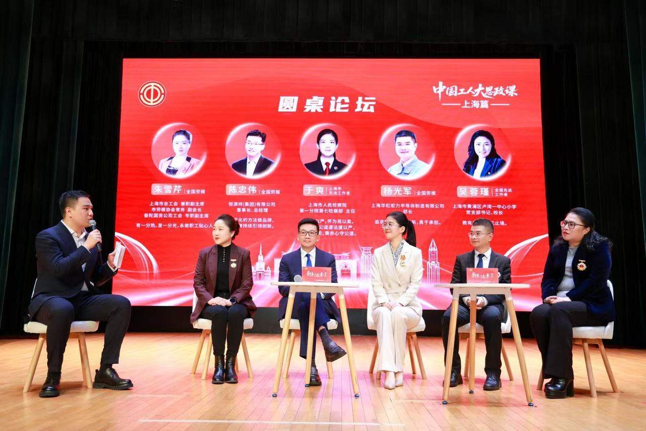 五位宣講人,五個(gè)不同崗位,傳遞同一個(gè)信念:勞動(dòng)最光榮,奮斗最美麗。全國(guó)勞模、上海市總工會(huì)兼職副主席朱雪芹,這位從縫紉女工成長(zhǎng)起來的“娘家人”,用30年奮斗歷程告訴每一位勞動(dòng)者:不忘來時(shí)路,奮進(jìn)正當(dāng)時(shí)。全國(guó)勞模、恒源祥掌門人陳忠偉用“絨耀之花”、11.9微米極細(xì)羊毛和“恒愛行動(dòng)”,詮釋百年品牌的匠心與溫度;上海市先進(jìn)工作者、上海市人民檢察院第一分院第七檢察部主任于爽講述與“零口供”案件死磕到底的日夜,那聲被害人母親哽咽的“謝謝”讓全場(chǎng)動(dòng)容;全國(guó)勞動(dòng)模范、上海華虹宏力半導(dǎo)體制造有限公司部長(zhǎng)楊光軍分享從清華學(xué)子到“中國(guó)芯”匠人的十六年堅(jiān)守,終化作示波器上強(qiáng)健有力的“心跳”;全國(guó)先進(jìn)工作者、黃浦區(qū)盧灣一中心小學(xué)校長(zhǎng)吳蓉瑾帶來“教育百寶箱”:一本寫滿秘密的“晴雨表”、一本存滿記憶的“紅喇叭”手冊(cè)、一朵跨越山海的“數(shù)智云”。