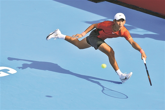 1月1日,在香港維多利亞公園網球場舉行的香港網球公開賽男單正賽首輪比賽中,中國選手商竣程以2比1戰勝塞爾維亞選手拉斯洛·杰雷,晉級16強。圖為商竣程在比賽中回球。新華社記者 盧炳輝 攝