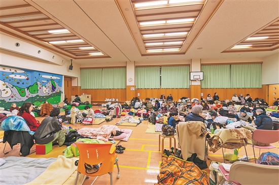 當?shù)貢r間1月3日,人們在日本石川縣輪島市一處容納超700人的臨時避難所內(nèi)休息。新華社記者 張笑宇 攝