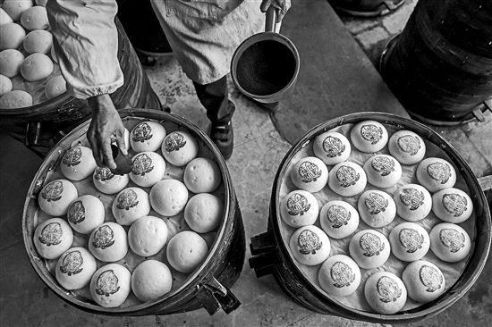 1月3日,在金華市金東區赤松鎮二仙橋村,65歲的姚國憲在給蒸好的饅頭蓋上傳統紅印。