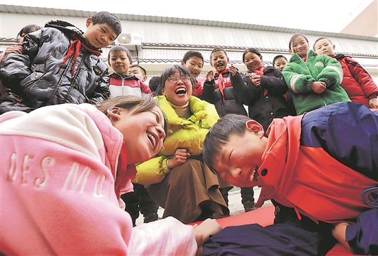 1月3日,湖北省竹山縣寶豐鎮紅衛小學,老師正在給學生上以“直面挫折,珍愛生命”為主題的心理健康教育課,組織孩子們做掰手腕、老鷹捉小雞等減壓游戲。朱本雙 攝