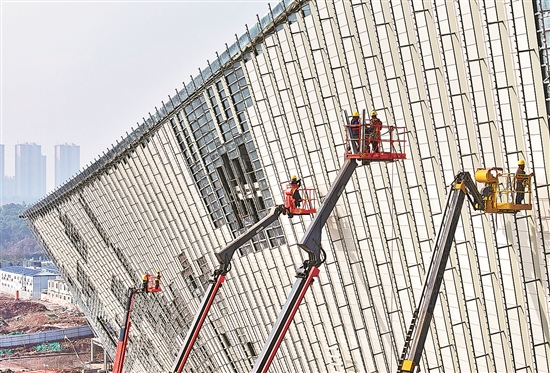 1月4日,在江西省南昌市紅谷灘區的南昌保利大劇院項目建設工地,十余臺曲臂車伸出“長臂”,工人們在高空中進行外幕墻安裝施工。朱海鵬 攝