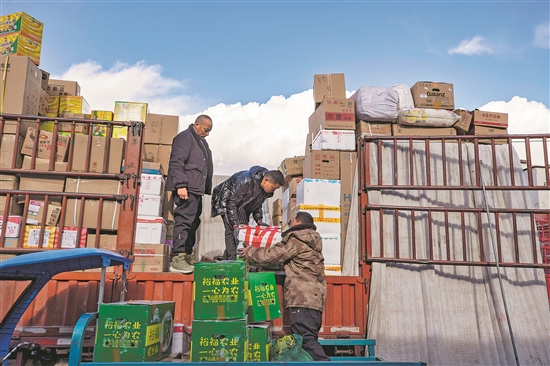 圖為西藏那曲市申扎縣供銷合作社員工在拉薩為偏遠鄉(xiāng)鎮(zhèn)果蔬配送試點項目的貨車上貨。