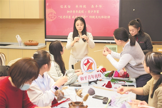 1月3日晚上,天津市和平區青少年宮,剛剛下班的青年職工正在學習絨花制作。