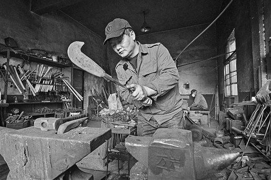 2023年12月7日,藍炳忠在鐵匠鋪里打制一把鐮刀。