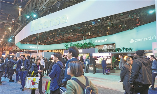 當地時間1月9日,人們在美國拉斯維加斯消費電子展上參觀海信公司展臺。