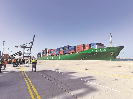 當地時間1月9日,在埃及亞歷山大,阿布基爾集裝箱港口碼頭迎來第一艘船“中谷吉林”號靠港。新華社發(徐剛 攝)