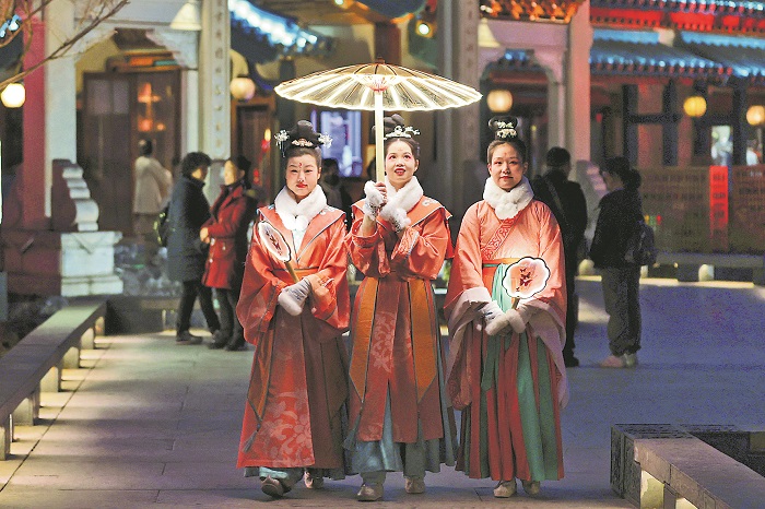 1 月 11 日,在江蘇南京牛首山文化旅游區金陵小城,3名景區工作人員身著古裝,在一片仿古建筑中漫游。小城曲徑通幽,以“一街、一水、一禪、一堂、一館、兩湖”為脈絡,通過移步易景的場景變化,生動再現游宴雅集、名士風雅的千年金陵風華。本報記者 吳凡 攝
