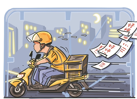 王連景告訴記者,像他這樣的老騎手,一般都會(huì)順路同時(shí)多送幾單,有時(shí)剛?cè)⊥瓴停唵螘r(shí)間已經(jīng)“余額不足”,不得不跟時(shí)間賽跑。“一旦超時(shí),一單6元~7元的配送費(fèi)就要被扣掉一半,遇到顧客投訴或者差評(píng),平臺(tái)還要額外扣錢(qián)。”