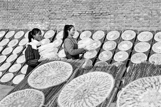 近年來,河北省邢臺市廣宗縣按照民間傳統(tǒng)手工工藝做法,將綠豆深加工成綠色農(nóng)產(chǎn)品,讓傳統(tǒng)農(nóng)產(chǎn)品增值,助力農(nóng)民增收。圖為廣宗縣劉南蘇村村民在搬運(yùn)加工的綠豆粉皮。新華社發(fā)(張馳 攝)