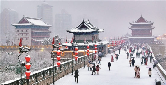 1月16日拍攝的西安城墻。當(dāng)日,西安迎來降雪。1月15日起,陜西省多地迎來2024年首場降雪,交通、環(huán)衛(wèi)等部門及時響應(yīng),積極應(yīng)對冰雪天氣。新華社記者 劉瀟 攝