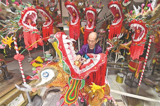 1月16日,在廣西賓陽縣賓州鎮三聯街,鄒玉特在裝龍珠。