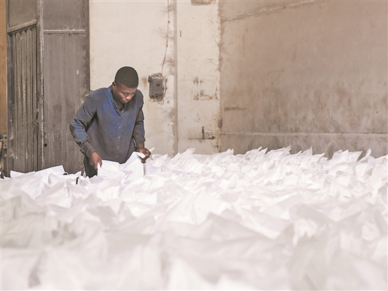 近日,在多哥阿尼耶制糖聯合企業,一名工人將裝袋完畢的白糖擺放整齊。新華社記者 李亞輝 攝