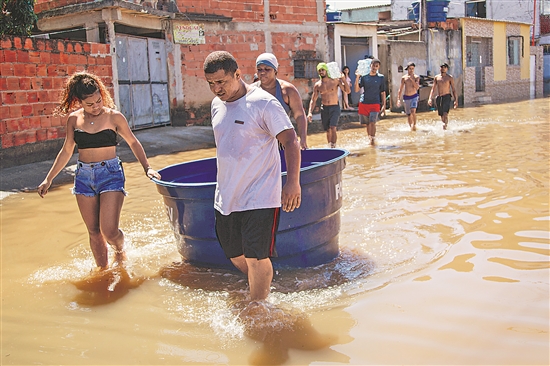 當地時間1月16日,在巴西里約州卡希亞斯公爵城,志愿者為受災居民送飲用水。巴西里約熱內盧州本月13日晚開始的暴雨導致里約市北區和里約州內陸多座城市受災嚴重,共造成12人死亡。里約州社會發展和人權廳16日通報,暴雨過后里約州內陸地區有9000多人無家可歸,目前正在積極進行災后重建。新華社發(克勞迪婭·馬爾提尼 攝)