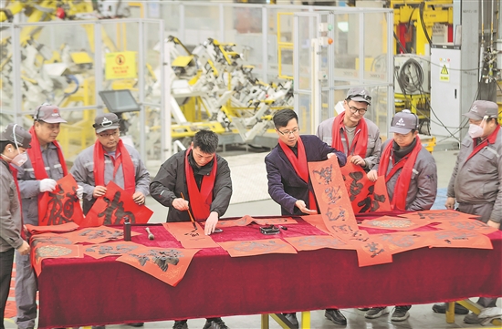 1月16日,浙江省湖州市莫干山高新區、德清縣阜溪街道總工會組織書法家志愿者走進企業車間,為工人寫春聯、送福字。