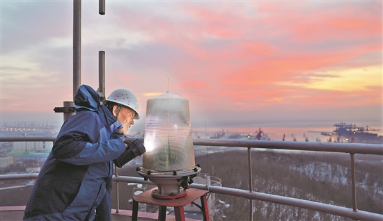 1月5日傍晚,王洪安在臺子山燈塔頂部檢查備用燈器工作狀態,一旦主燈器出現故障,備用燈器將啟動工作。