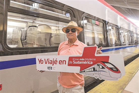 近日,在智利圣地亞哥中央車站內,一名乘客舉著“我乘坐了南美洲最現代列車”的標語與列車合影。新華社發 (豪爾赫·比列加斯 攝)
