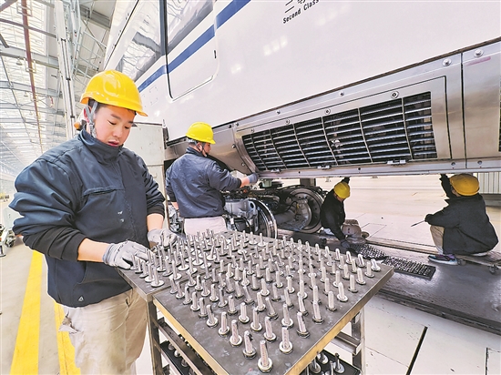 裙底板螺栓安裝是動(dòng)車組檢修中的一道關(guān)鍵工序,一列動(dòng)車組8000余個(gè)螺栓絕不能漏裝1個(gè)。中國鐵路西安局集團(tuán)有限公司西安動(dòng)車段檢修車間以精益化管理為抓手,制作了螺栓定制擺放工裝,作業(yè)前根據(jù)每節(jié)車廂螺栓使用量來組合“螺栓方陣”,讓操作人員在安裝過程中實(shí)時(shí)掌握螺栓數(shù)量,避免漏裝。王曙天 攝