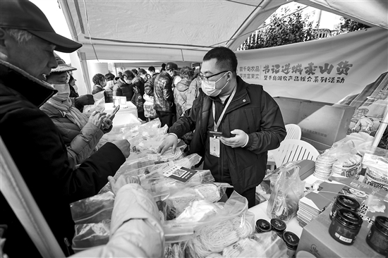 春節(jié)臨近,杭州市民在千島湖農(nóng)產(chǎn)品推介現(xiàn)場(chǎng)的展位前選購(gòu)特色農(nóng)產(chǎn)品。當(dāng)日,在杭州市運(yùn)河廣場(chǎng),浙江省杭州市淳安縣23個(gè)鄉(xiāng)鎮(zhèn)的基層書(shū)記們帶著100多種淳安千島湖優(yōu)質(zhì)農(nóng)產(chǎn)品,參加淳安“書(shū)記進(jìn)城賣山貨”暨千島湖農(nóng)產(chǎn)品推介系列活動(dòng),吸引市民紛紛駐足品嘗挑選。