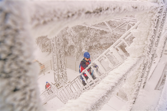 1月23日,在重慶市酉陽土家族苗族自治縣涂市鎮麻田村,電力工人在覆冰觀測點檢查覆冰情況。