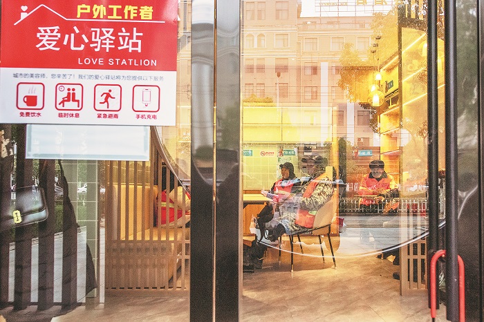 1月22日,安徽省蕪湖市繁昌區繁陽鎮安定東路,環衛工人在溫暖的愛心驛站內歇息。 近年來,繁昌區總工會和城市管理等部門設立工會愛心驛站、人民城市驛站等場所,為環衛工人、快遞小哥、外賣騎手等戶外勞動者提供夏能納涼、冬可取暖的港灣,免費提供熱水、充電、應急藥品等便利貼心服務。本報通訊員 肖本祥 攝