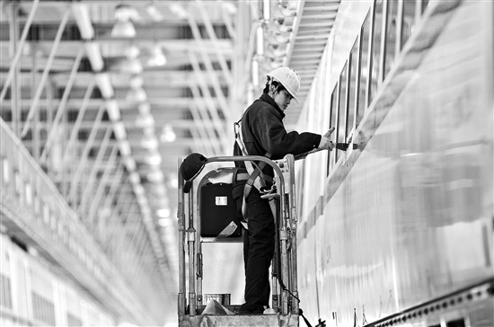 1月23日,桂林動車所工作人員在檢修動車。