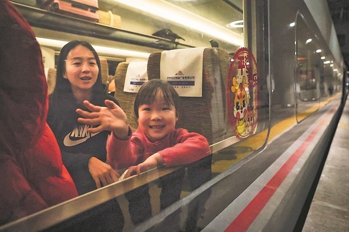 1月26日春運首日,北京西站,乘坐G6701次列車的小女孩向窗外揮手。本報記者 蔚可任 攝