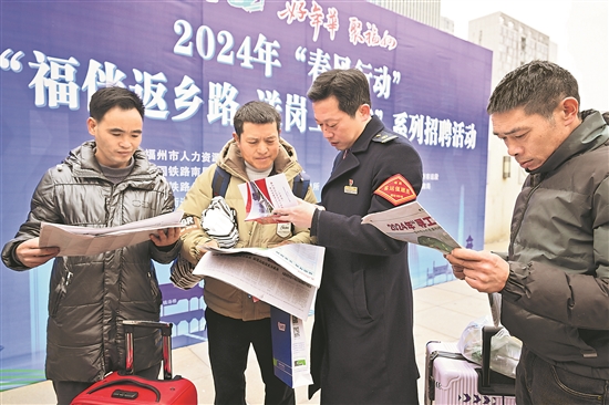 1月26日中午,一千余名外出務工人員坐上了由福建省勞動就業服務局、福州市人力社保局聯合福州火車站工會共同組織的“在榕務工人員返鄉專列”。在站前廣場和候車室里,車站客運工作人員、工會志愿者為務工人員送上“尋工地圖”,提供就業信息。當天,共有8家企業帶來50余個工種1753個崗位。